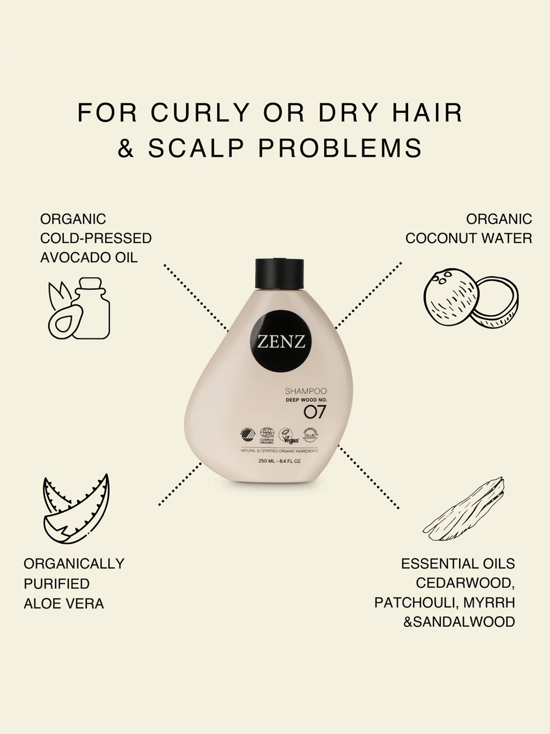 Shampoo Deep Wood Nr. 07 von Zenz Organic ist ein dänisches Shampoo mit dem Ecolabel Nordic Swan. Es bietet einen warmen Duft von Zedernholz, Patchouli, Myrrhe und Sandelholz aus ätherischen Ölen und pflegt das Haar mit biologisch gereinigter Aloe Vera, kaltgepresstem Avocadoöl und Kokosnusswasser.