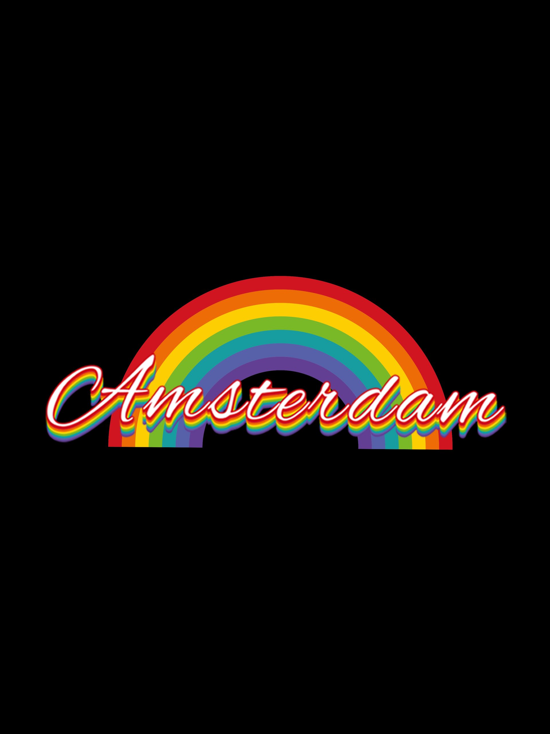 T-shirt af økologisk GOTS certificeret bomuld med en regnbue i pridefarver og teksten “Amsterdam”.